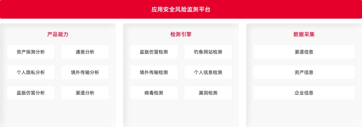| 资产探测 | 通过采集引擎实时帮助企业发现互联网渠道上的应用资产,涵盖Android、iOS、小程序、公众号。通过资产认领,让企业实时掌握应用资产家底。 |