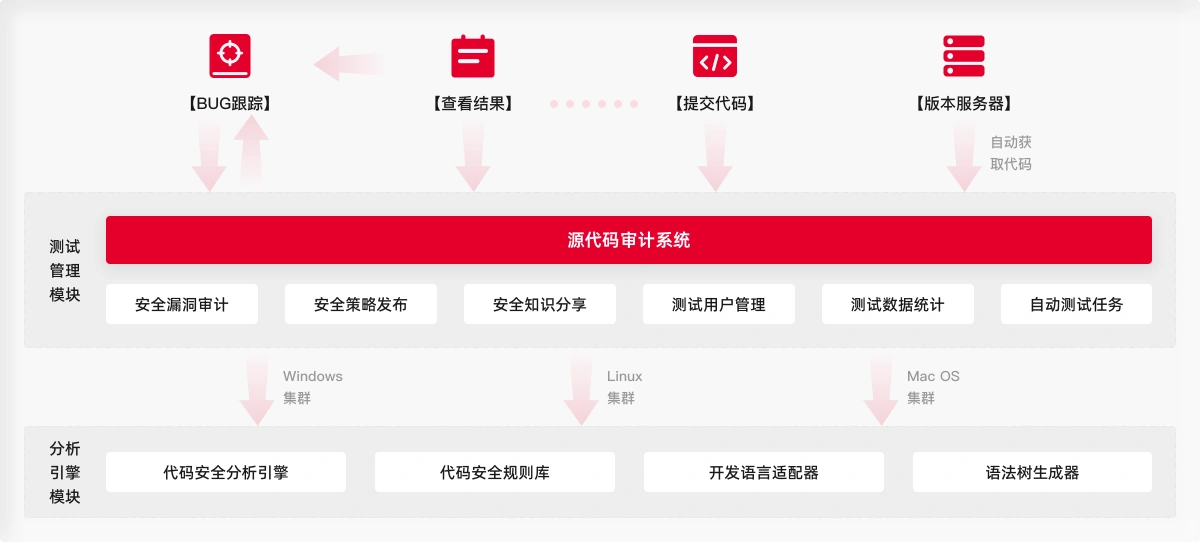 立即咨询测试系统主要分为两个模块,一个是分析引擎模块,一个是测试管理模块。不同平台上开发的软件代码可以通过中间的分布式调度方式来完成分发调度测试。如图所示: