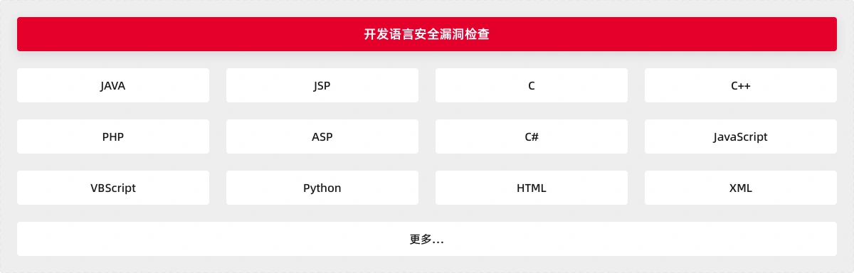 目前可以支持对 JAVA、JSP、 C、C++、PHP、ASP、 C#、JavaScript、VBScript、Python、HTML、XML、GO、SQL、kotlin、Objective-C、ArkTS等三十多种开发语言的安全漏洞的检查,共能够检测出约2000种漏洞。爱加密源代码审计系统将所有安全漏洞系统地整理并依据漏洞的表现形式、形成原因和危害程序进行科学地分类,共分为“输入验证、API 误用、质量性能、异常处理、代码规范、安全控制、环境配置、信息封装”8个大类,然后根据开发语言的不同,在结合国际漏洞标准组织CWE的漏洞知识库进行细分和命名,目前约1000个子类。