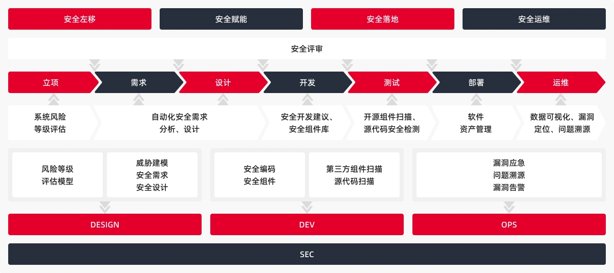 | 安全知识库管理 | 提供丰富知识库作为基础支撑,包括安全合规知识库、安全需求知识库、安全设计知识库、安全编码示例知识库、安全测试用例知识库;在日常使用的同时,实现安全知识持续沉淀能力。 |