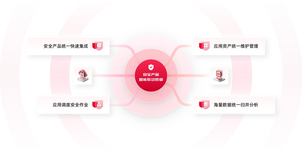 | 数据中心 | 平台提供所有已集成安全服务的数据采集,针对不同服务的安全能力进行深度的解析,通过函数关系规则将不同来源、不同格式的无规则元数据映射成平台统一结构化的数据,为平台数据分析提供全面的数据源。 |