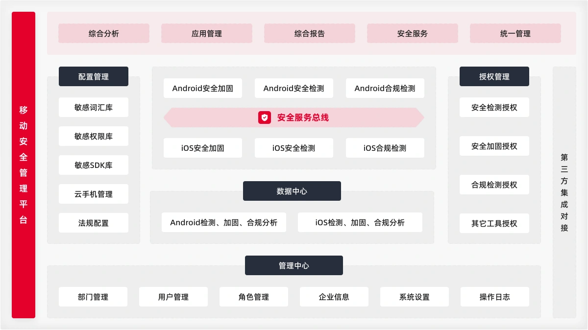 | 配置管理 | 平台提供配置管理功能,涵盖敏感词汇库、敏感权限库、敏感SDK库、云手机管理、法规配置。 |